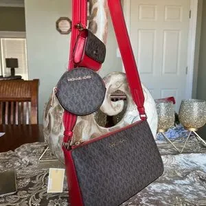 Michael Kors Brown/black Signature Gold-Tone Hardware Detachable Airpod Case Detachable Coin Pouch Thick 1.5" Powder Blush Strap With a 16" Drop Zip Closure Three Interior Card Holders Interior Slip Pocket Approximately : 9" x 6" x 2.5"