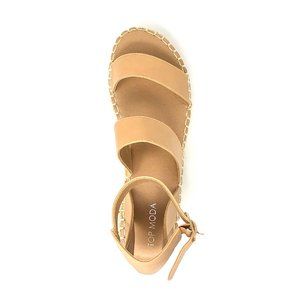 These creamy, butterscotch, tan beige espadrille sandals are what your wardrobe dreams are made of. These fun espadrille sandals include an ankle strap with a buckle and clasp for closure. Double vegan leather straps for foot cover (Middle strap include an attached elastic strap for better fit). A wedge espadrille design sole with a platform inside.