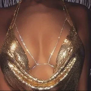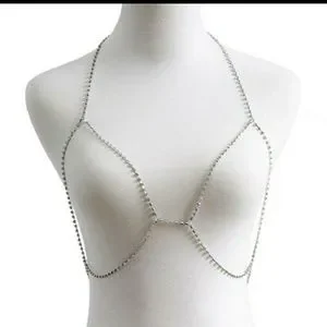 Beautifully crafted hollowed out design. Completely lined in 3mm Gorgeous Rhinestone chain, that Pops, Shines and Sparkles in every direction. Adjustable lengths: Neck - up to 39". Chest - up to 42"... shimmer silver sets this off superbly, Extenuate your neckline absolutely Amazingly.