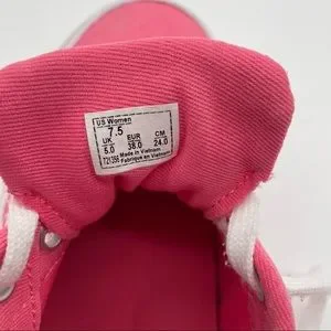 Vans Off the Wall pink sneakers in women’s size 7.5. There are a few marks on the white portion of the shoes. (See photos)