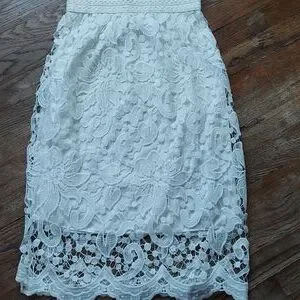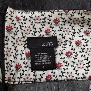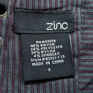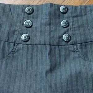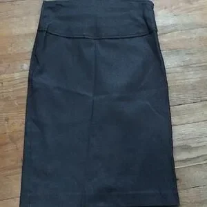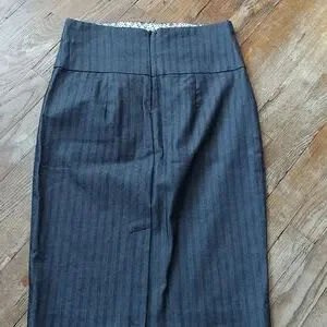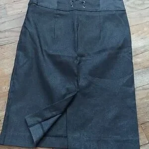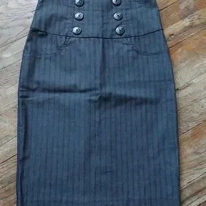 Three skirts. the first skirt is black has lots of stretch. Very figure flattering. Has a zipper on side. The back has a lace tie up. really sexy. Slit on bottom. Brand is Zinc. Size 3. Awesome skirt. The second skirt also figure flattering with some stretch. Has a wide waist band. with 6 big cute buttons in front. Zipper on back with a slit on bottom. pinstriped with gets n black. Brand is zinc Size is 3. The 3rd skirt is beautiful. It is a small/medium. Has a lining underneath. It is a slip on skirt. The waist band has lots of stretch. The waist band stretches up to 18' from a 13'. It is 100% polyester.