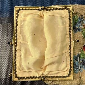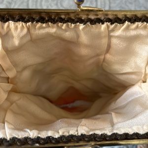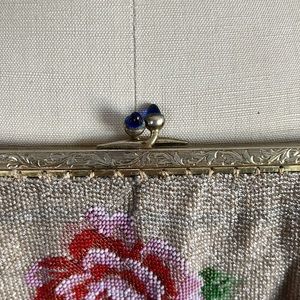 Vintage microbeaded purse with rose detail. Clasp is adorned with blue “jewels”. Inside liner is torn at bottom as seen in picture.