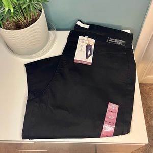 NWT Signature Levi Strauss Totally Shaping Pull-On Skinny Jean in Black. Size 18, W34, L28. Pull-on style jeans (jeggings) with elastic waist.Faux front pockets, functional back pockets. 75% Cotton, 23% Polyester, 2% Elastane. Made responsibly with Water<Less technique by Levi Strauss Co.