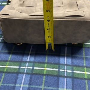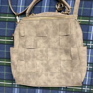 The front is woven and the finish looks faux suede. But it feels more like faux or patent leather. There is no name tag. But it’s probably from Kohl’s since that was where my wife shopped a lot. The back looks like you use the strap to convert it to a back pack. But we have no idea how exactly. So no guarantee on that. Lol. And the condition is like New. I never saw my wife use it. And not my style.