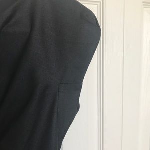 Black, fully-lined (with silk) draped dress by BCBGMaxAzria Runway. Cap sleeves, faux-wrap skirt. Draping in front carries over right shoulder to top of back. Cutout-style back. Zipper at waist. Fabric is lightweight with a slightly knobbly texture, like linen. Sight sheen. 100% polyester, lining 100% silk. Black, some images lightened to show detail. (First and last photos are to show fit and not of actual dress for sale.)