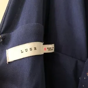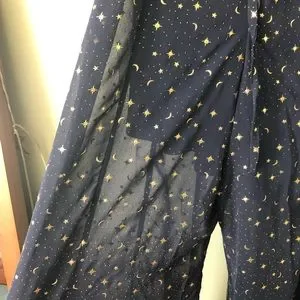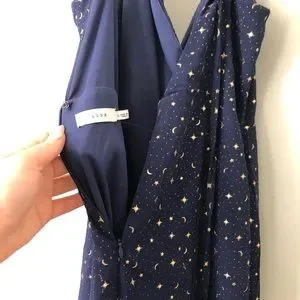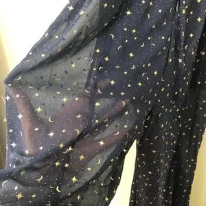 This jumpsuit is AMAZING but sadly too small. A beautiful navy blue with tiny gold stars and moons covering it, it has sheer wide, hi-lo legs that are slightly cropped, with solid shorts lining inside. Also features a back zipper and tie. Absolutely magical!!! ๐๐โจ๐ซ
