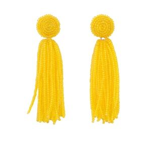 MEGAN PARK bead weave earrings. Woven by hand from glass seed beads in a translucent yellow coloration. Suspended from a woven bead weave floret stud, hang playful beaded tassels, creating subtle movement when worn. Light in weight, these earrings will elevate and add a playfully sophistication to your evening and day outfits