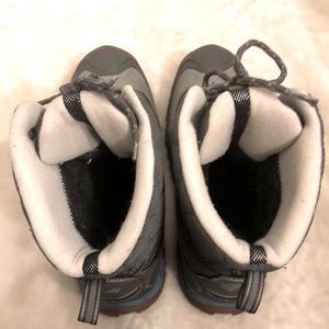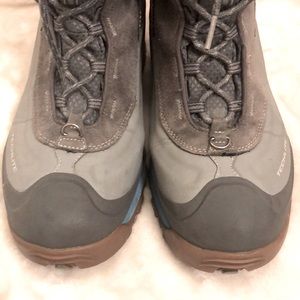 Excellent pre-owned FLAWLESS condition CLEAN gray/turquoise waterproof mid-shaft lace up winter snow boots by COLUMIA. Size womens 11.