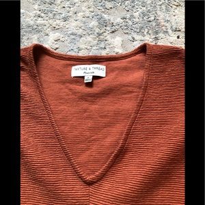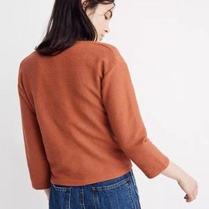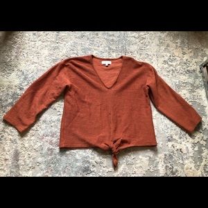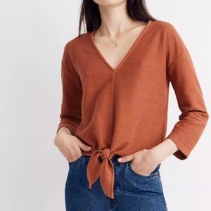 This Madewell Texture & Thread Tie Front Blouse is in excellent used condition. The color is a burnt orange. It has a ribbed look,- v neckline, and 3/4 sleeves. There are no noted flaws, stains, or signs of wear. Please let me know if you have any questions before purchasing. Thank you!