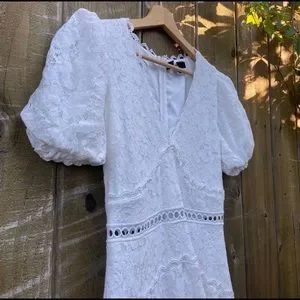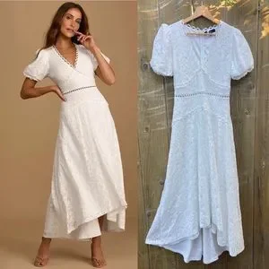 The Lulus Always in Mind White Lace Puff Sleeve High Low Midi Dress features an intricate lace overlay, atop a white knit lining, that shapes a V-neckline, a darted bodice, and trendy short puff sleeves with elastic cuffs. A set-in waist is trimmed with cutout crochet lace before falling to a concaved, high-low midi skirt. Crochet accents the neck, bodice, and waist.