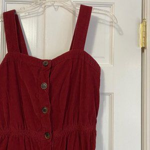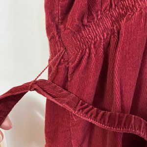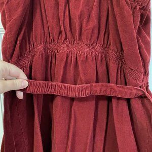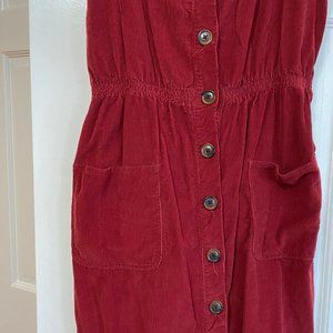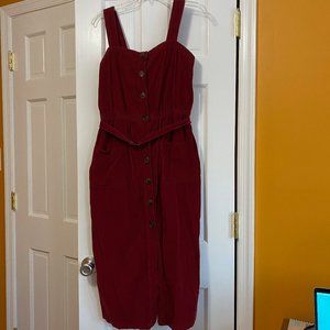 Ribbed button down corduroy midi dress from Urban Outfitters in a wine red color. Tortoise shell buttons (brown and black) up the front of the dress. Pockets on the front. Comes with detachable belt with a metal clasp. Belt runs small, but easy to detach with no issue. Lightly worn with little signs of wear.