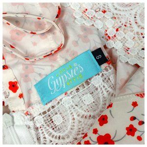 This little Summer Dress is designed with Love for mixing Poppy flowers and Lace. Features a Plunging V-neck, and Peek-a-boo Crochet Lace at the Waist. Hidden Back Zip.