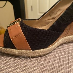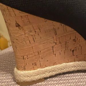 Black linen upper with gold logo and leather cross strap on vamp / Peep toe opening / 4" cork wedge heel / Leather padded foot bed / Rubber sole / Braided jute trim / Pairs well with business and casual attire