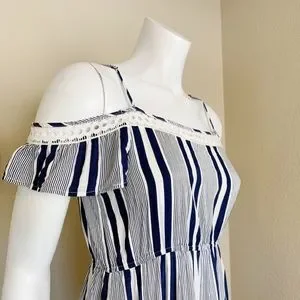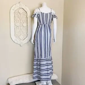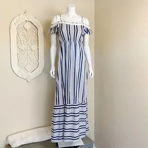 A beautiful blue and white striped maxi dress by Pinkblush. Features a cold shoulder neckline and crochet accents.