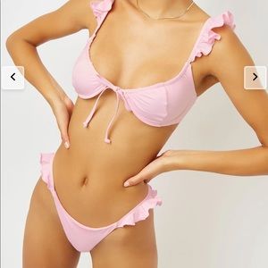 Super cute light pink medium bikini top, bottoms are size small! Underwire with ruffle shoulders. Just too small for me but the tags are on and never worn :) Willing to sell separately as well