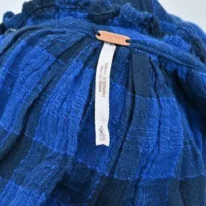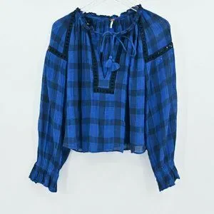 FREE PEOPLE Women's Size XS Honey Grove Blue Black Eyelet Ruffle Sleeve Plaid Top Embroidered Tassels