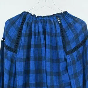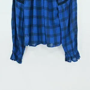 FREE PEOPLE Womens Size XS Honey Grove Blue Black Eyelet Ruffle Sleeve Plaid Top