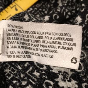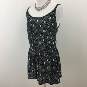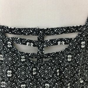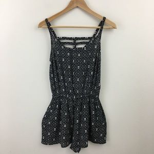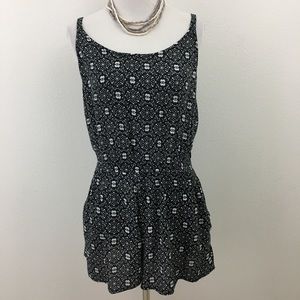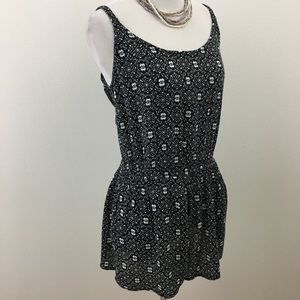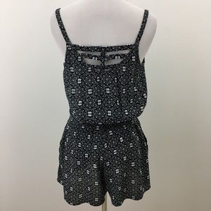 Black & white shorts romper has cutout in back, two side pockets & spaghetti straps. Content is 100% Rayon. Measurements flat are approximately 17.5” pit to pit, elastic waist 12” relaxed to 22” stretched, 12.5” rise & 2.25” inseam. In excellent preowned condition with NO spots or damage.