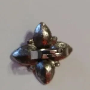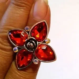 This Ring has a metal rose in the center with red and clear crystals on an adjustable ring. This is from a jewelry store closing sale.