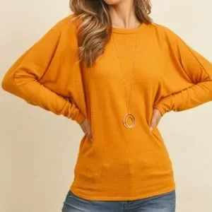 Long Sleeve Top. Super soft, brushed hacci. Gorgeous wardrobe staple. Mustard yellow like color. Long, dolman style sleeves. 96 polyester 4 spandex. Fit is true to size. New boutique item.
