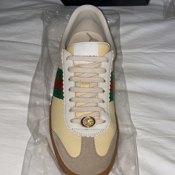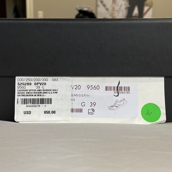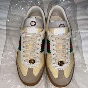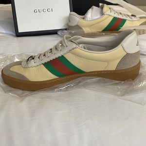 Gucci sneakers…wore once, in original box. These are Men’s shoes, but I loved and wore them. Extremely versatile with the seasons. Looks great with trousers/jeans chunky sweater into the spring and summer with your favorite dress or skirt. Size 39 G74 Leather sneaker with web