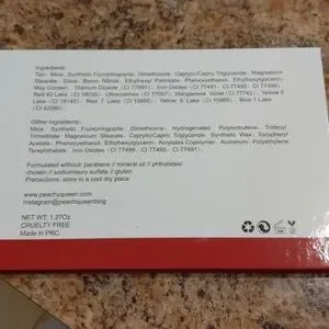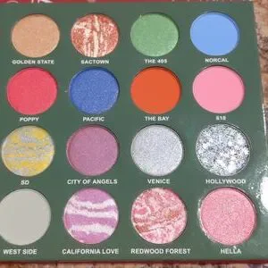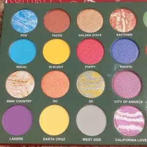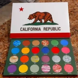 Indie brand, Peachy Queen Cosmetics California inspired palette. Unique interior cover with a state shaped mirror. This is a 24 pan palette with mattes, shimmers and a pressed glitter. Six of the shades are marbled colors. These colors are vibrant everyday shades and a couple of pops of colors.