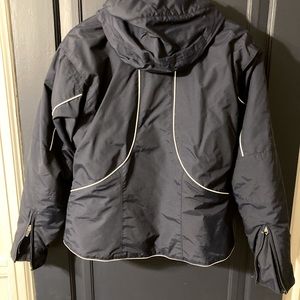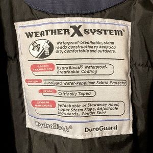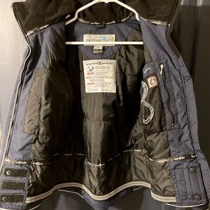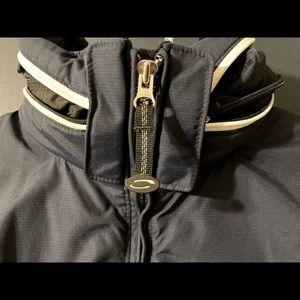Excellent condition navy with white trim, fully insulated, soft cuffs, stowable or fully removable hood, full of pockets and goggle pouch