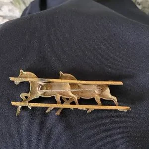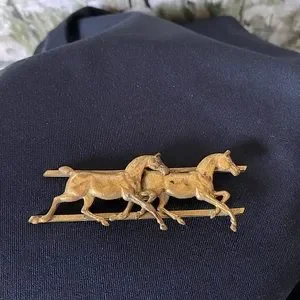 Vintage running horses brooch. Full disclosure I believe it is made of brass but I am not for certain. Have had for around 35 years.