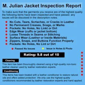This jacket has been fully inspected and any issued are listed in photos and report. A professional leather cleaner and conditioner were applied to remove any dirt and provide a protective finish on the jacket. The jacket will be wrapped in paper and plastic film placed in a plastic bag and then in a cardboard box with additional padding. We never use plastic envelopes to ship!