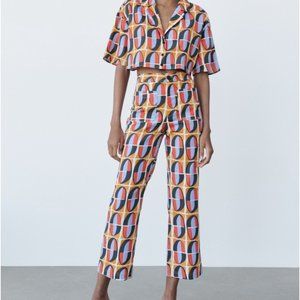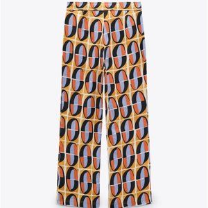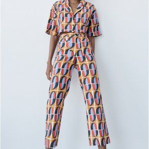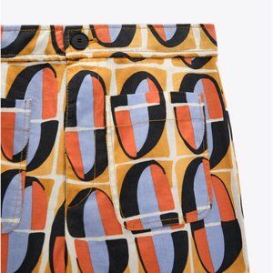 Zara pants made of linen and cotton blend fabric. High-waisted with front patch pockets. Straight leg. Front zip and button closure. Really fun geometric retro print!