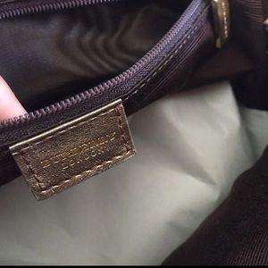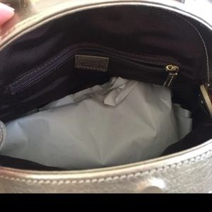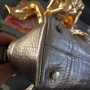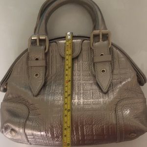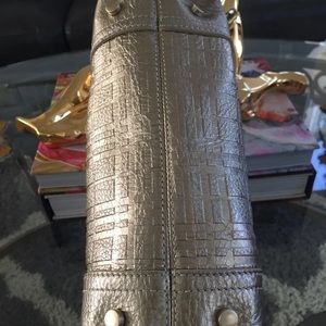 Authentic! Small size. Rare Metallic champagne gold embossed Novacheck leather bag. Some signs of wear on bottom corners and handle strap. Clean inside. Cute little satchel!