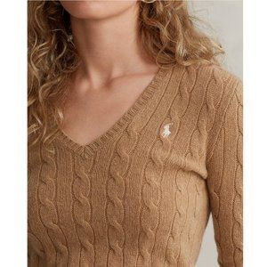Polo Ralph Lauren Cashmere Merino Wool Cable Knit Jumper Sweater Camel Tan Vneck