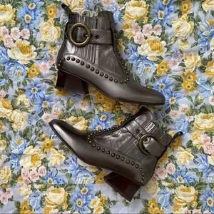 This season our designers return the Chelsea Boot to its daintier, Victorian roots with this striking silhouette crafted in shimmering Italian leather. Ornate buckle hardware and studs with an antique brass finish add a custom-cast metal edge to the block-heeled pair, while elastic goring on both sides allows them to be slipped on and off with ease.