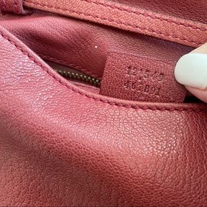 The bag has front flap with press stud closer and large Gucci leather and brass studded Logo There is an inner pocket which zips closed and a detachable strap