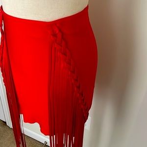 Red Bandage Mini Skirt w/ Fringe Braided Detail