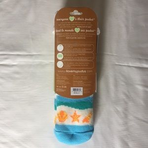 Pudus Slipper Socks w/ seashell detail are fuzzy on the inside, thanks to the animal friendly plush lining. The high density faux fur traps heat for ultimate warmth and the nonslip gripper soles improve traction. Lightweight, yet warm and comfortable. Perfect on a rainy day! NEW in package, however no price tag. Fabric: outer: 100% acrylic, inner: 100% polyester. Made in China.