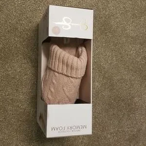 Soft and have memory foam! Really cute indoor and outdoor slippers. Brand new and are a size L 8/9.