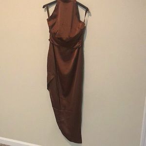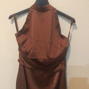 Brown, Satin dress, with frontal belt and high slit. Open back