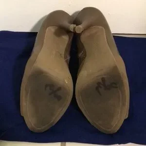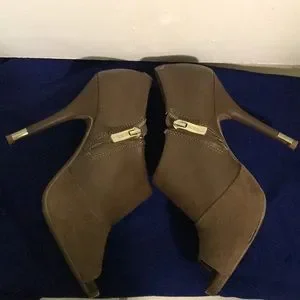 BCBG Generation peep toe bootie heels. Tan color man made upper and lining. Suede with faux leather. Perfect to wear with pencil skirt/ mini skirt or trousers/pants/ or skinny jeans. Heel rubber.