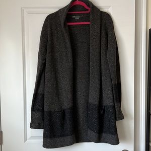 A classic COZY Vince cardigan!! Dark heathered gray with black stripe on the bottom (where the pockets are) is a truly timeless piece! Easily dressed up adding on to velvet pants/blouse or dress or can be worn day to day! Either way - you’ll be kept warm and comfy! I wore this when I was about a size 8 but think it is true to size Vince!