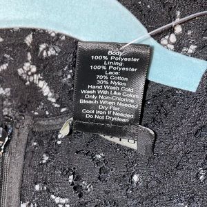 New with tags. In the same condition I bought it in. It was marked down slightly due to the tag coming unattached on one side. Could be easily reattached. You can see that in one of the pictures. No other flaws. Second layer underneath. Lace at the top is see through. Dress comes in slightly in the middle and flares at the bottom.