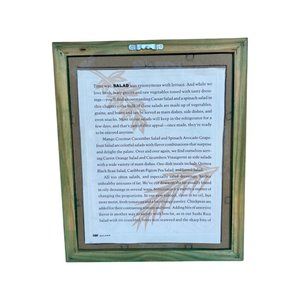 “Salad” print in glass and green wood frame with sawtooth bracket for hanging. Print is a page from Moosewood recipe book.