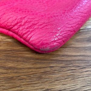 Pink Leather Wristlet from Kate Spade. Zipper Closure. Small zippered pocket on the front. Good Condition. Small mark near the emblem and light wear on the bottom corners.