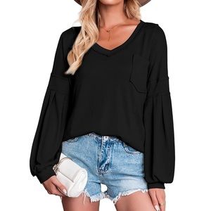 V neck, long sleeve, oversized, off shoulder, knit top, chest pocket, solid color shirts for women, casual tunic tops