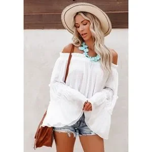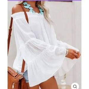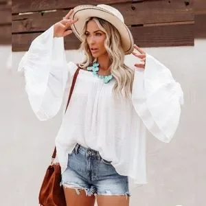 Chic white boho flowy off the shoulder tiered bell sleeve tunic top