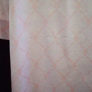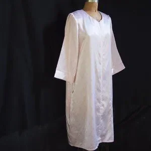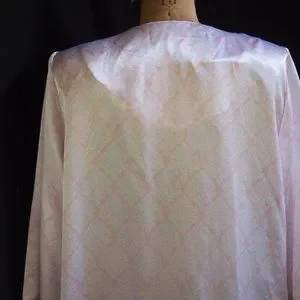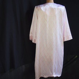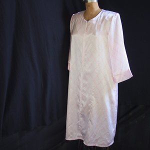 This mid-calf or ballerina length zip front robe is by Kassatly Palm Beach. The print is a white floral diamond shape on a pink background. Zips up the front. Pockets in side seams. Shoulder pads that could easily be removed.