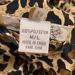 Features: lightweight leopard print fabric, short fit, long sleeves, wrap style closure with sash, shoulder pads that can be removed, and pockets!