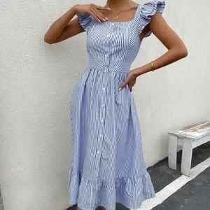 Boho Blue Stripes Ruffle Sleeve Button up Midi Dress