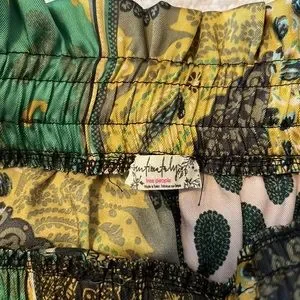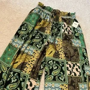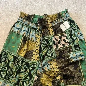 Green patchwork patterned Free People pants, have a satin-y shine and feel to them and are brand new with tags!