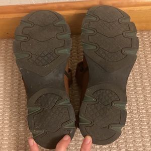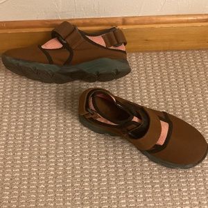 GUC sneakers with green rubber soles, pink mesh, and Velcro details on top and heel. Very comfortable and true to size.